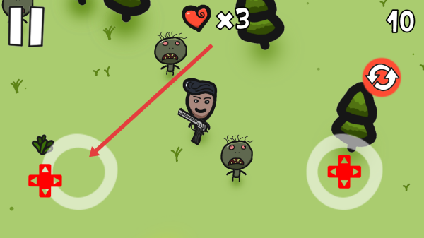 3、戰(zhàn)斗時(shí),操控左側(cè)搖桿移動(dòng)角色,瞄準(zhǔn)僵尸射擊,躲避攻擊,完成“僵尸獵手”的生存挑戰(zhàn)。