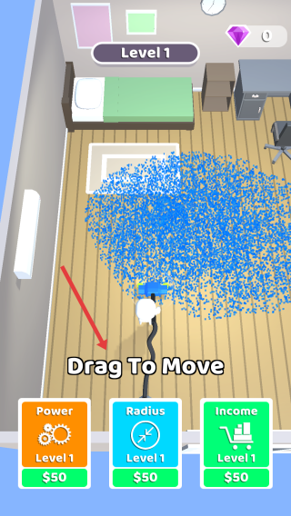 1、移動(dòng)操作:手指拖動(dòng)屏幕,控制手持吸塵器的白色小人,在房間場(chǎng)景中自由移動(dòng),規(guī)劃吸塵路徑。