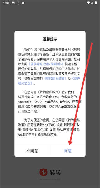 1、點擊“溫馨提示”彈窗的“同意”,進入轉(zhuǎn)轉(zhuǎn)APP主界面。