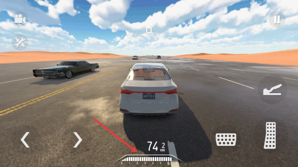 2、進(jìn)入沙漠公路場(chǎng)景,依據(jù)車速【74.2】等數(shù)據(jù),操控車輛躲避其他汽車,在道路上穩(wěn)定行駛。