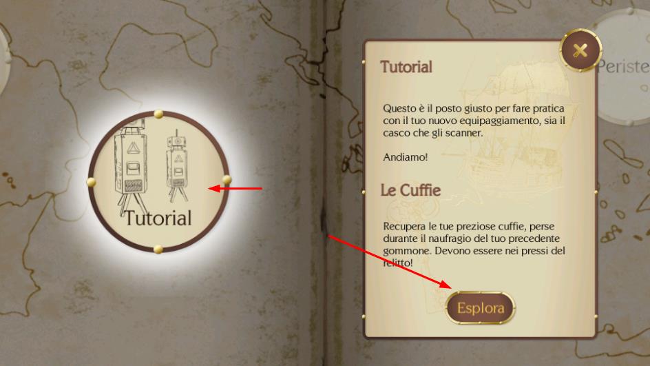 2、在地圖界面,選擇“Tutorial”(教程),點擊“Esplora”(探索),熟悉裝備操作。