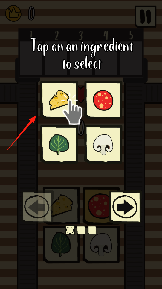 1、進入游戲后在食材界面,根據(jù)提示“Taponaningredienttoselect”,點擊箭頭指向的奶酪等食材,為制作披薩備料。