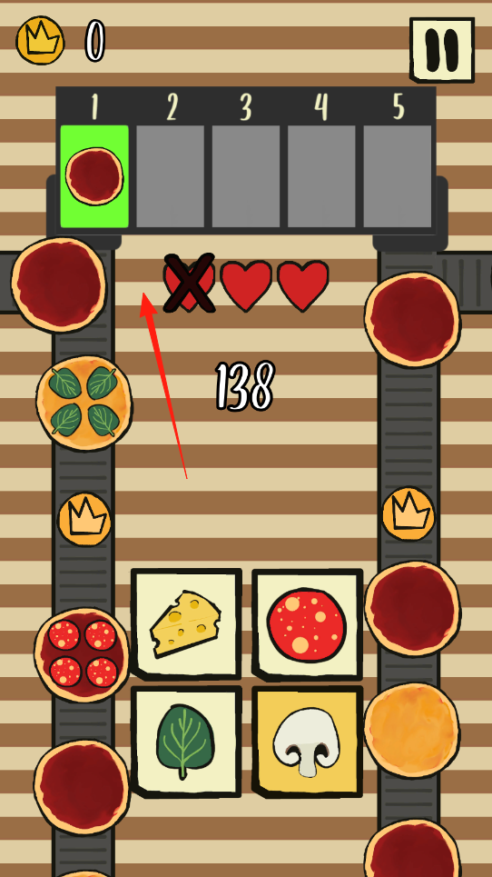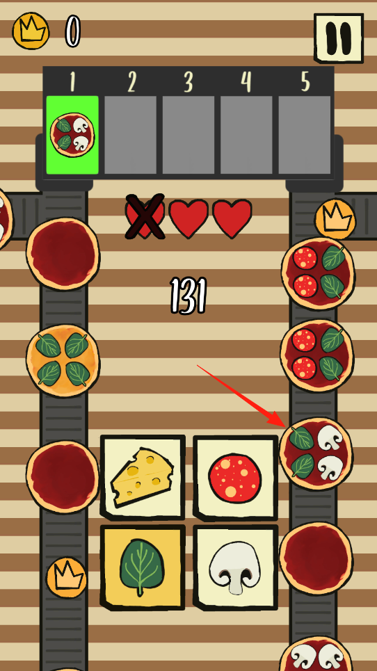 2、進入制作場景,觀察傳送帶上的披薩訂單(箭頭指向),訂單顯示需添加的食材,快速選取對應食材。