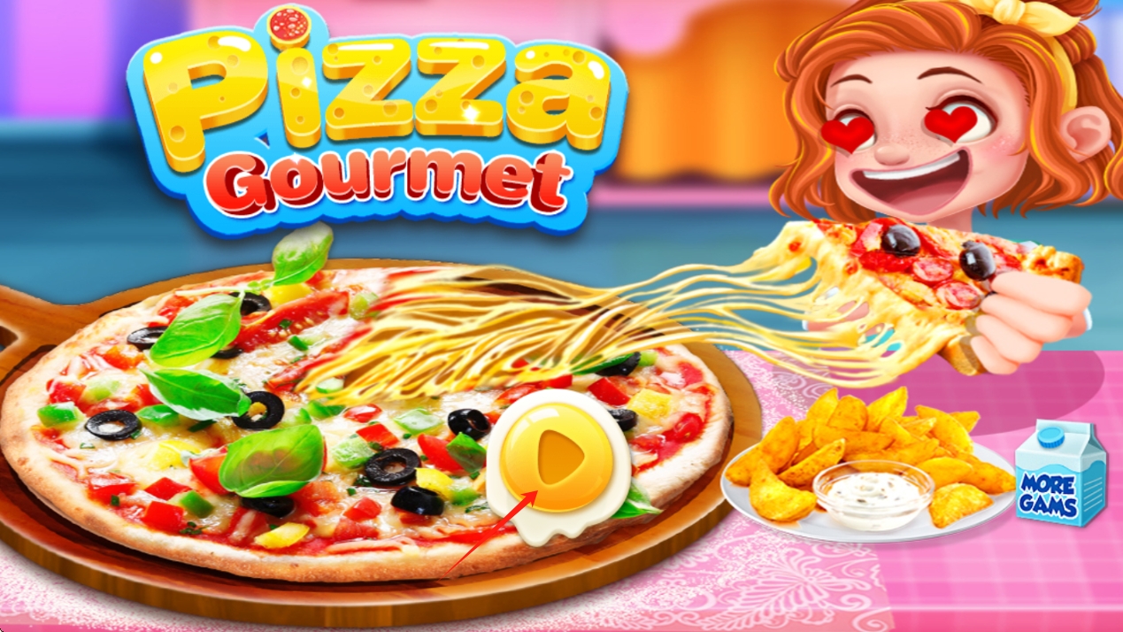 1、游戲標(biāo)題界面,展示披薩、小吃、牛奶,有播放按鈕,角色手持披薩,突出美食制作主題,點(diǎn)擊開(kāi)始。