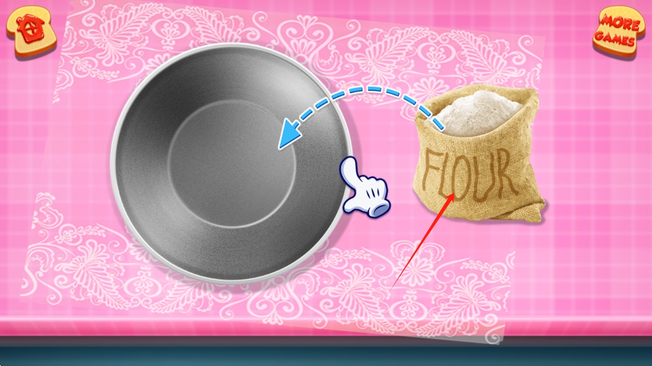 2、披薩制作步驟,引導(dǎo)將面粉倒入碗中,呈現(xiàn)基礎(chǔ)食材準(zhǔn)備環(huán)節(jié),點(diǎn)擊倒入面粉。
