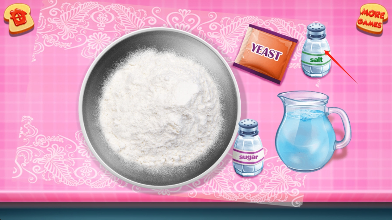 3、繼續(xù)制作流程,碗中已有面粉,需添加鹽、酵母、糖、水,推進(jìn)披薩面團(tuán)制作,點(diǎn)擊使用調(diào)料。