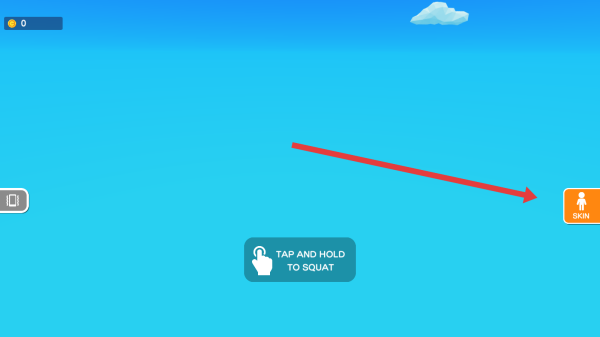 1、啟動頁通過點擊【SKIN】,進入角色定制后,按【TAP-AND-HOLD-TO-SQUAT】提示,長按操作角色蹲伏,開啟競技挑戰(zhàn)。