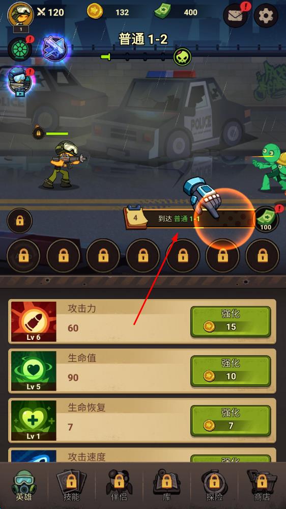 1、進(jìn)入游戲,按第一個(gè)手指亮點(diǎn)位置點(diǎn)擊領(lǐng)取初始獎(jiǎng)勵(lì),強(qiáng)化屬性點(diǎn),跟隨任務(wù)指引熟悉操作,準(zhǔn)備迎戰(zhàn)首個(gè)關(guān)卡的僵尸與首領(lǐng)。