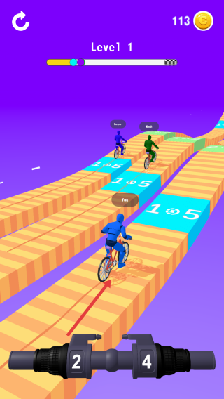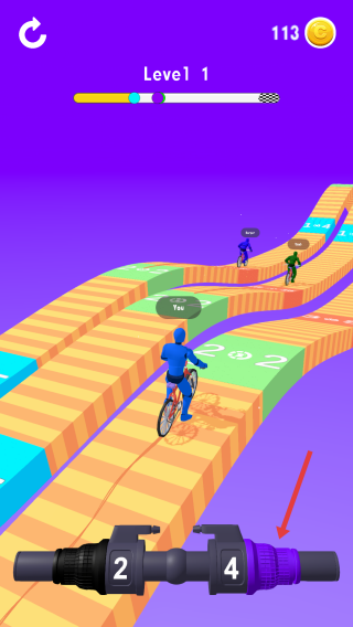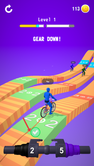 1、進(jìn)入Level1,操控藍(lán)色騎手騎自行車,根據(jù)賽道方塊數(shù)字如1×5、2×2,點(diǎn)擊下方2、4等檔位切換齒輪。