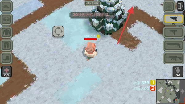 3、進入游戲場景后,操控角色移動,留意界面提示,收集武器裝備,與其他玩家或機器人對戰(zhàn),爭取在游戲區(qū)域收縮前存活并獲勝。