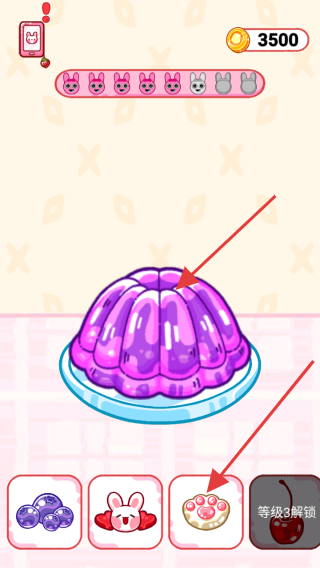 3、在果凍制作界面,根據(jù)等級解鎖情況,選擇如藍莓、兔子裝飾等裝飾元素,對紫色果凍進行裝飾,提升果凍吸引力,推進游戲任務。
