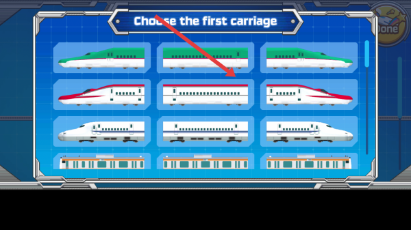 1、進入選車廂界面,按喜好選首節(jié)車廂如綠色車頭,觀察畫面來完成,兩輛車行駛。