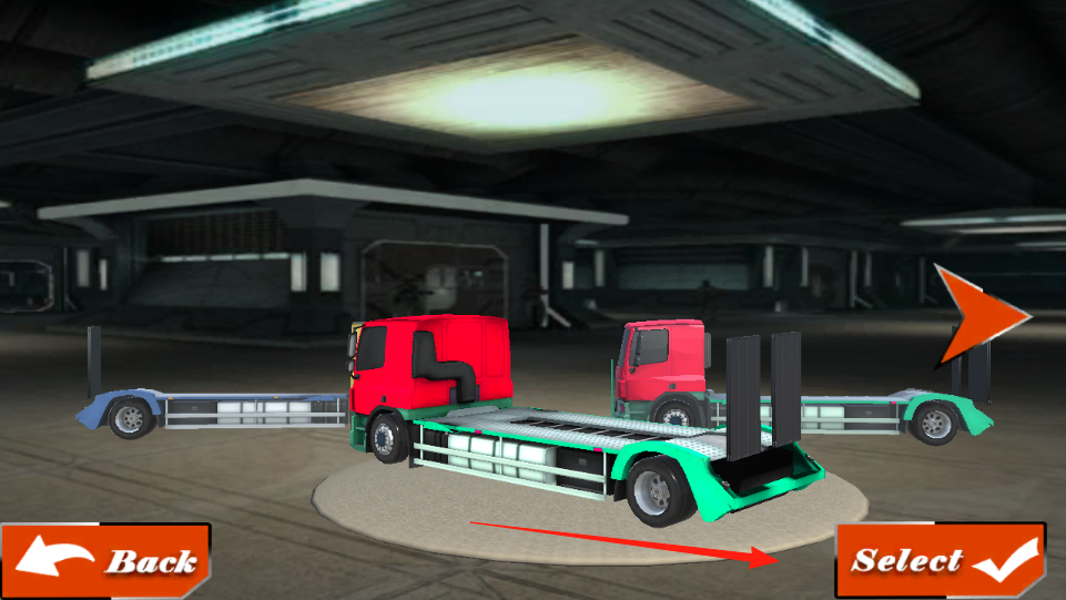 1、進(jìn)入游戲車庫界面,眼前有幾輛卡車,聚焦紅綠色的那輛,查看其外觀、載重等適配任務(wù)后,點(diǎn)擊Select按鈕選定,開啟運(yùn)輸挑戰(zhàn)。