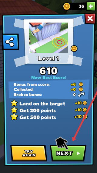 2、在Level-1結(jié)束后,進(jìn)入到結(jié)算界面時(shí),點(diǎn)擊NEXT按鈕,領(lǐng)取獎(jiǎng)勵(lì),進(jìn)入下一關(guān)選擇界面。