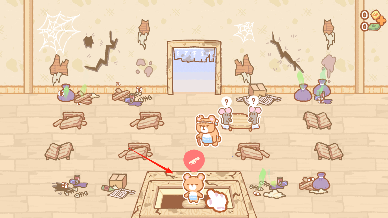 1、在破舊房間場景,操控小熊角色,靠近中間帶問號的洞口小熊,觸發(fā)互動,通過對話或任務(wù)指引,了解房間秘密,清理雜物、驅(qū)趕老鼠,修復(fù)房間設(shè)施,能解鎖新區(qū)域、獲取道具。