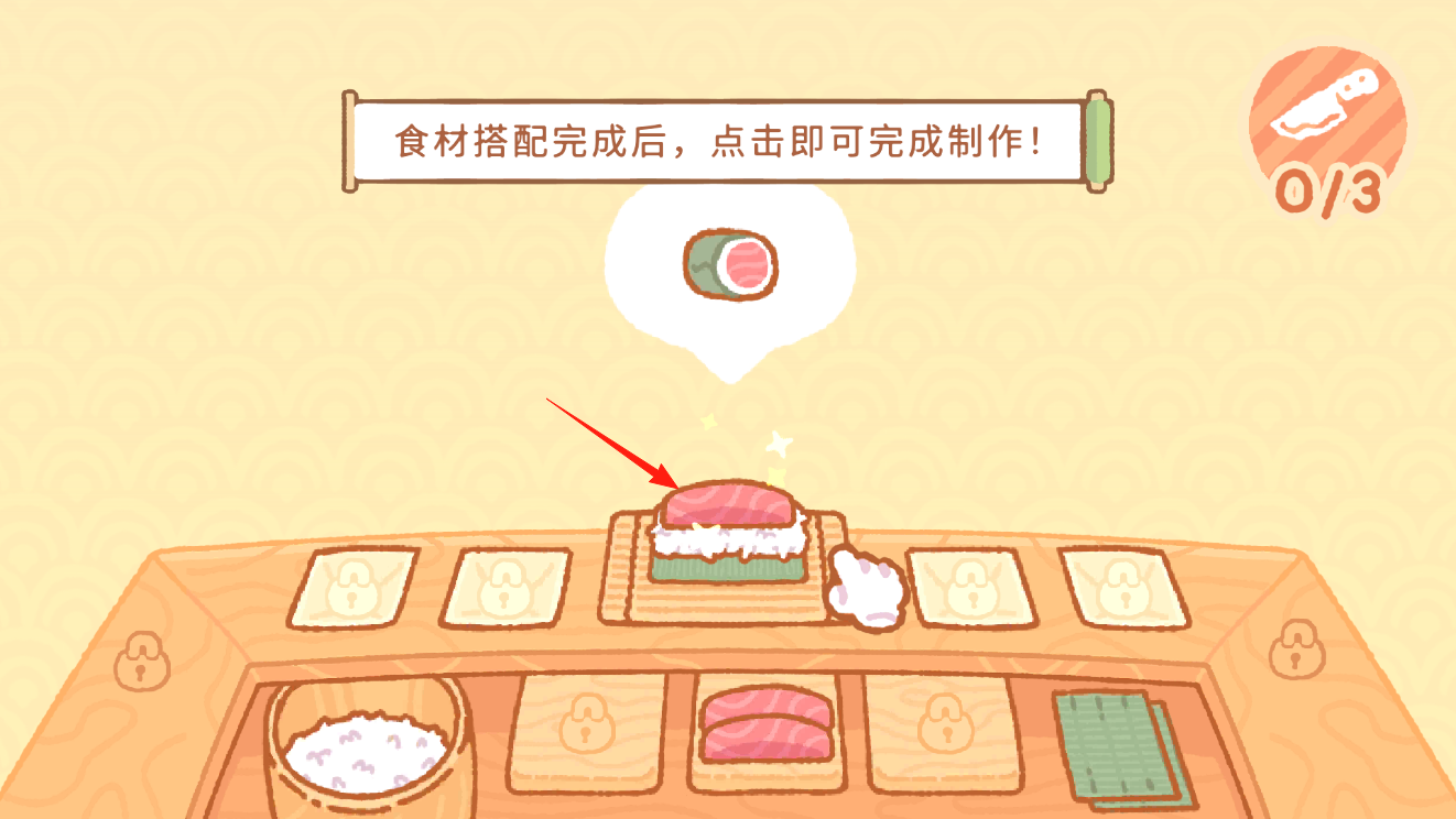 3、食材搭配完成后,檢查壽司組合是否符合上方圖案,確認(rèn)無誤后,點(diǎn)擊制作好的壽司,完成制作流程,成功制作可獲得獎勵,若搭配有誤,需重新調(diào)整食材。