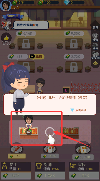 2、按住灶臺(tái)區(qū)域不放,激發(fā)廚師潛能,顯著縮短菜肴制作時(shí)長。