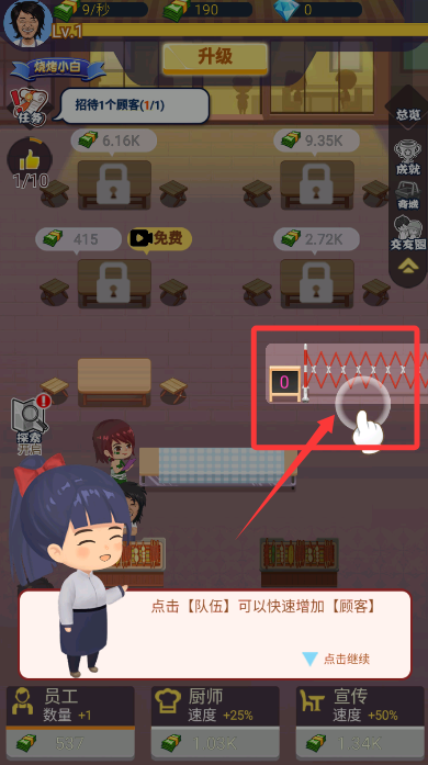 3、人才招募模塊,可以雇傭不同特性的助手,有的擅長快速翻烤,有的精于招呼客人,組建完美團(tuán)隊(duì)能讓經(jīng)營事半功倍。