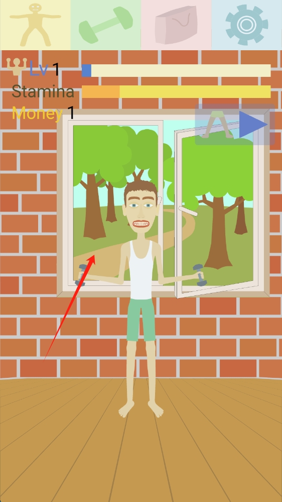 2、進(jìn)入Lv-1健身場景,操控角色,進(jìn)行啞鈴鍛煉,提升體力,積累金錢,點(diǎn)擊鍛煉身體。