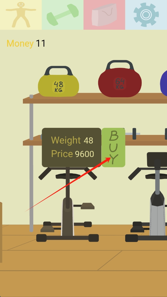 3、在商店界面,點(diǎn)擊BUY,購買健身器材,增強(qiáng)鍛煉效果,助力角色成長,點(diǎn)擊購買物品。