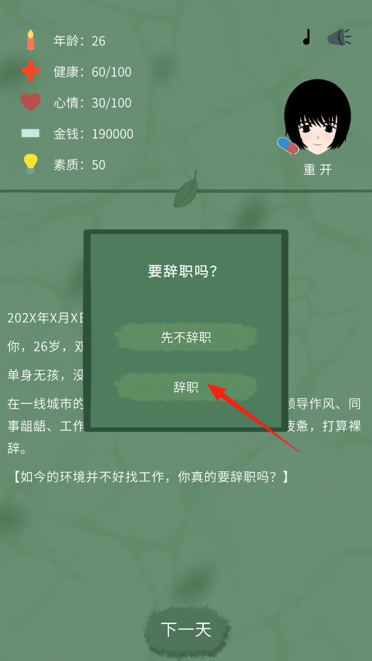 1、在角色狀態(tài)界面,遇到辭職抉擇彈窗,根據(jù)自身情況,選擇辭職或先不辭職,不同選擇會(huì)改變后續(xù)人生軌跡,通過決策,推進(jìn)劇情,感受人生模擬機(jī)制。