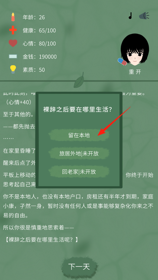 2、裸辭后進(jìn)入生活地點(diǎn)選擇環(huán)節(jié),彈窗呈現(xiàn)留在本地,旅居外地等選項(xiàng),點(diǎn)擊留在本地,依據(jù)角色背景,開啟對(duì)應(yīng)生活支線,體驗(yàn)本地生活的發(fā)展可能,延伸人生模擬劇情。
