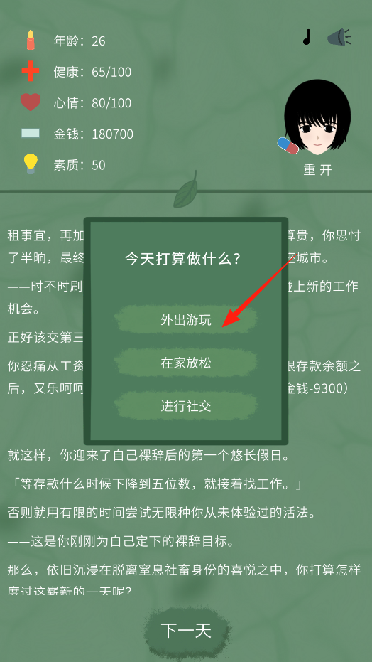 3、在裸辭后的日常規(guī)劃界面,彈窗有外出游玩,在家放松等選項(xiàng),選擇外出游玩,消耗金錢,提升心情,通過日?;顒?dòng)選擇,豐富人生模擬內(nèi)容。