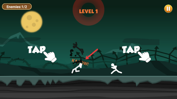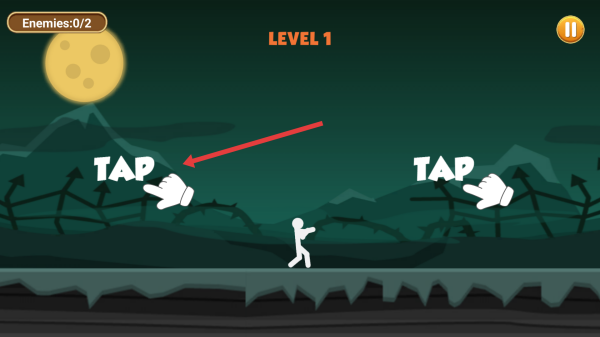 2、在Level1場(chǎng)景,敵人數(shù)量0/2時(shí),左右兩側(cè)出現(xiàn)TAP提示,點(diǎn)擊對(duì)應(yīng)側(cè)可控制角色移動(dòng)或準(zhǔn)備攻擊。