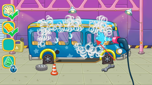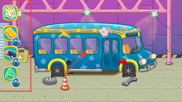 2、在汽車清潔界面,選擇左側(cè)紅色方框內(nèi)的清潔工具,然后對汽車上的污漬進行清潔操作。
