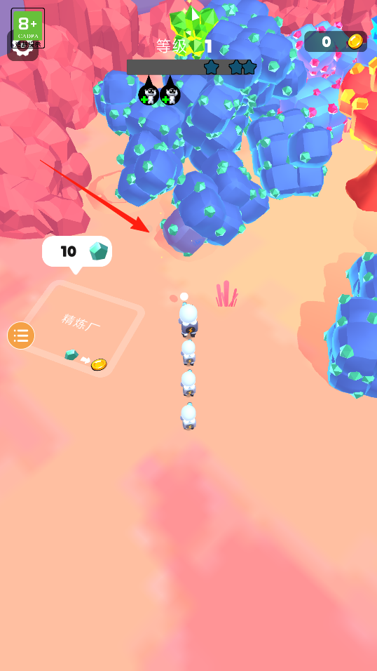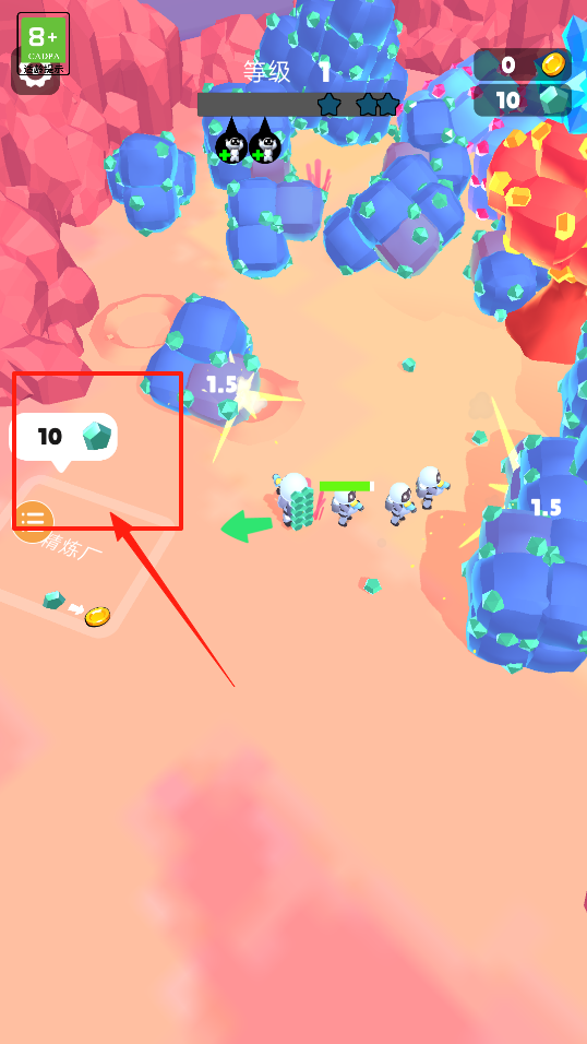 2、開采水晶時(shí)關(guān)注左側(cè)資源顯示,當(dāng)采集到一定數(shù)量引導(dǎo)角色返回精煉廠,提交水晶,兌換金幣或其他道具,體驗(yàn)資源提交玩法。