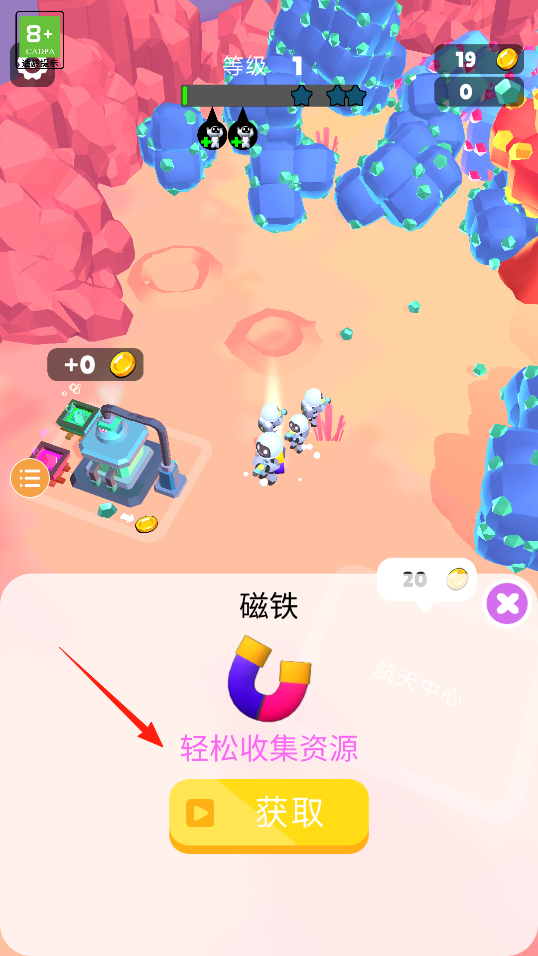 3、完成資源提交后界面彈出道具提示,點(diǎn)擊獲取解鎖磁鐵道具,使用后可自動(dòng)收集附近資源提升采集效率,體驗(yàn)道具解鎖機(jī)制。