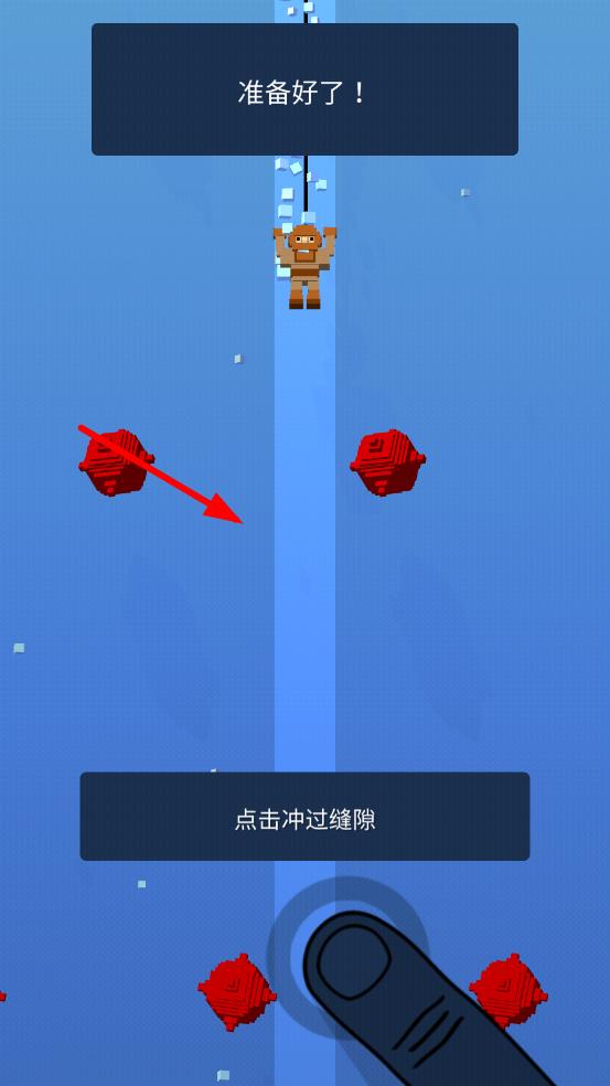 1、控制被繩子吊著的小人開始沉降,通過點擊屏幕進行沖刺,熟悉操作節(jié)奏,避開初始遇到的障礙物。