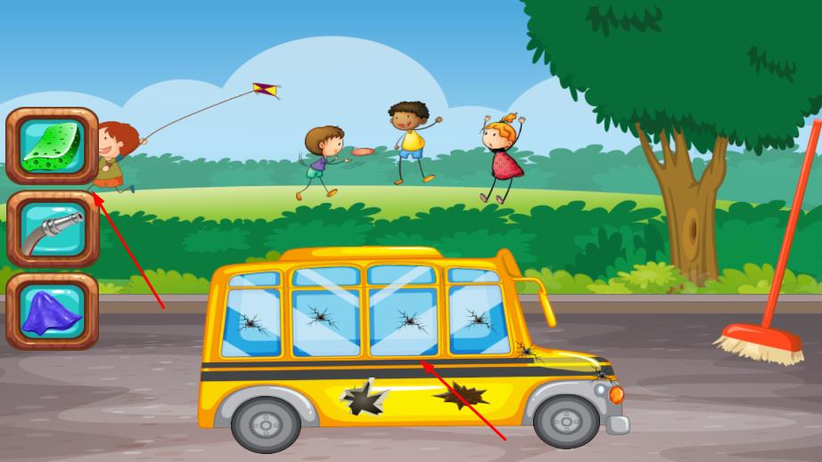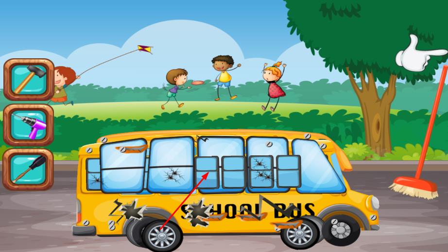 2、看到待修理的校車(chē),車(chē)身可能有破損、污漬等問(wèn)題,左側(cè)會(huì)顯示各種修理工具,根據(jù)校車(chē)的損壞情況,點(diǎn)擊相應(yīng)的工具,對(duì)校車(chē)進(jìn)行清潔、修復(fù)等操作。