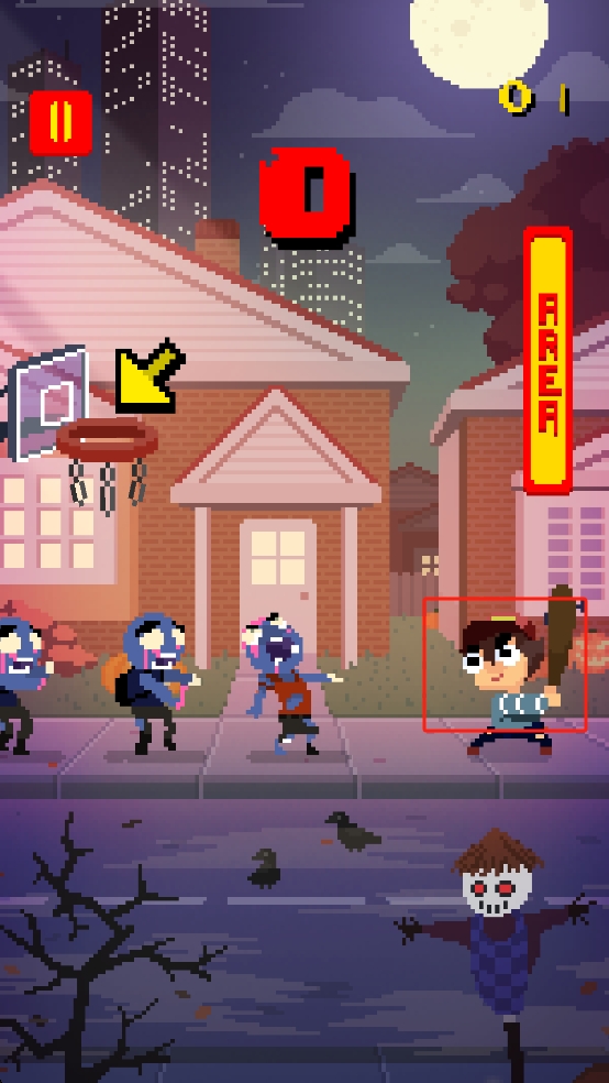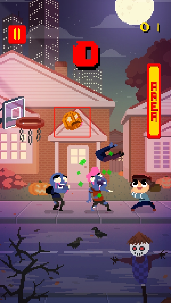 2、街道場景中,綠色僵尸一瘸一拐逼近,操控角色在適當(dāng)?shù)臅r機(jī)揮舞球棒,把僵尸的頭顱打向球框,進(jìn)行得分。