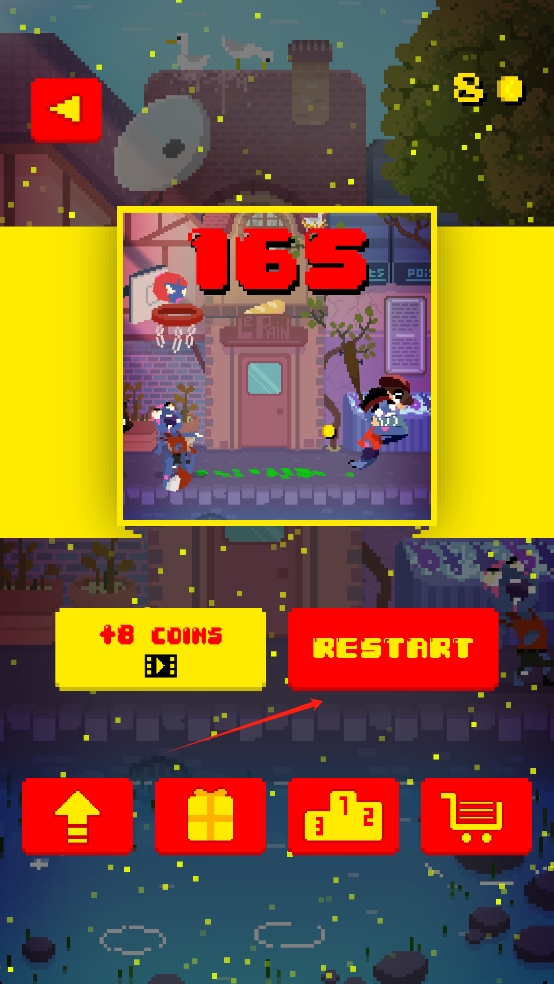 3、關(guān)卡失敗后,界面顯示RESTART按鈕,點(diǎn)擊重新開始挑戰(zhàn),也可看廣告領(lǐng)8金幣,再嘗試突破。