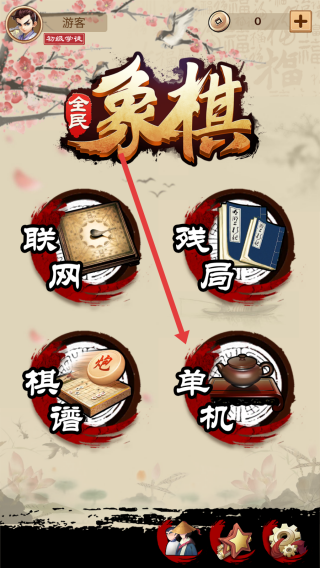 1、在全民象棋主界面中,按照指示點擊單機按鈕,進入單機模式選擇頁面開啟單人象棋對戰(zhàn)。