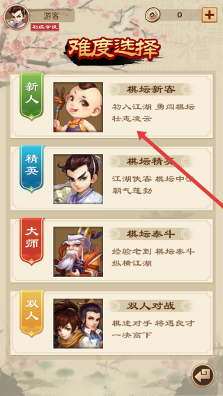 2、在難度選擇界面,可以點擊選擇棋壇新客,以新人難度開啟棋局,體驗初入江湖的象棋對戰(zhàn)。