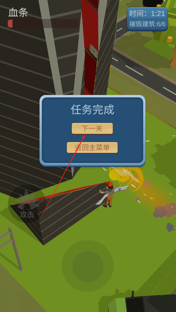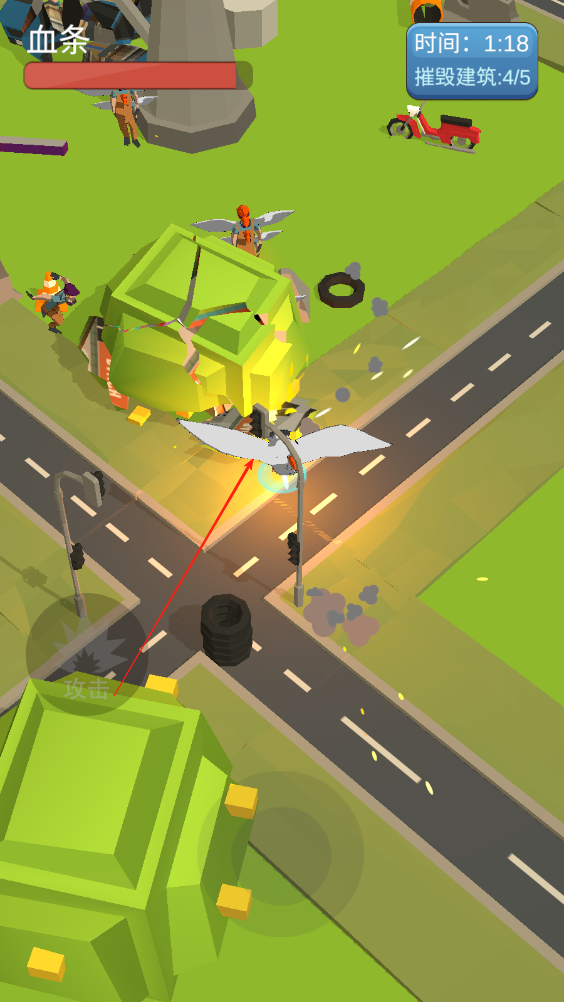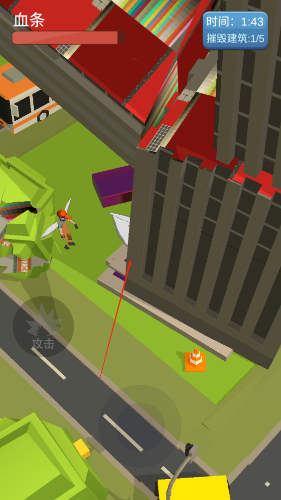 2、在城市場(chǎng)景里自由活動(dòng),注意觀察右上角的摧毀任務(wù),頂撞建筑的時(shí)候點(diǎn)擊攻擊,即可撞毀建筑。