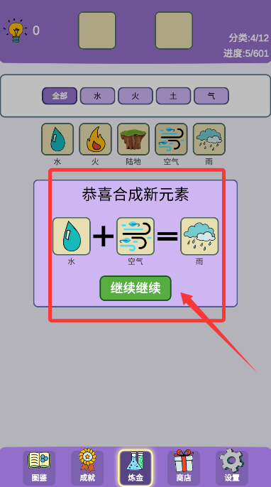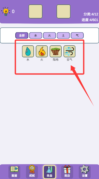 2、自由挑選"水""火"等初始素材進(jìn)行組合實(shí)驗(yàn),探索元素轉(zhuǎn)化規(guī)律。