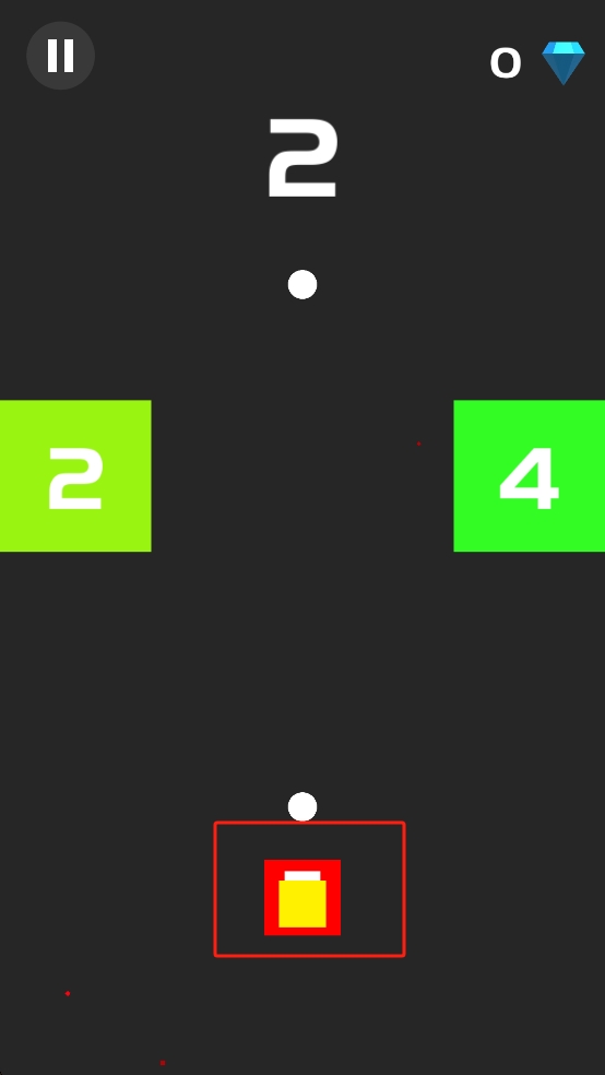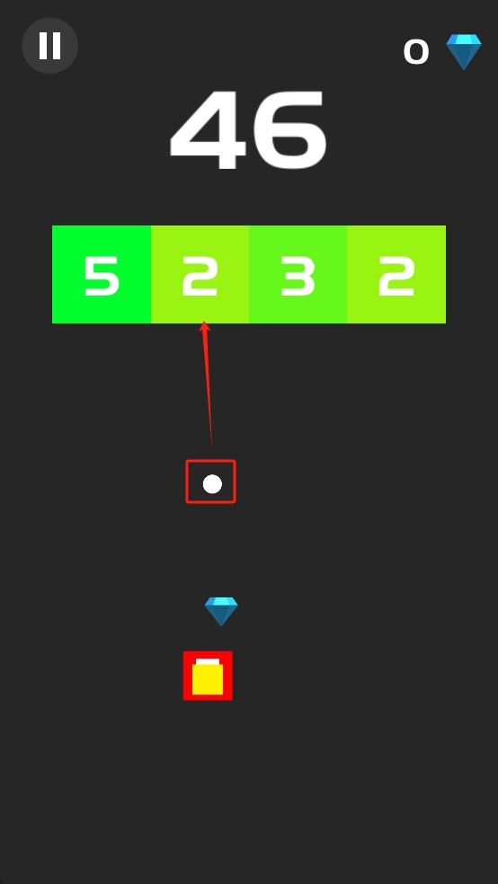 1、進(jìn)入作品后我們點(diǎn)擊屏幕控制小球發(fā)射方向,讓其撞擊數(shù)字方塊,優(yōu)先撞數(shù)值小的,達(dá)成快速消除。