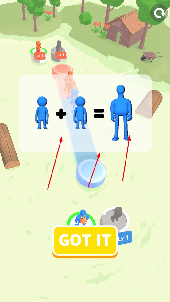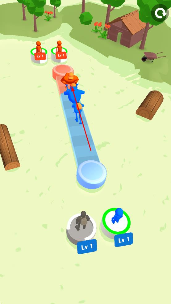3、操控合成后的高等級角色,沿通道前進(jìn)與橙色Lv1角色對戰(zhàn),擊敗對手獲取勝利,推進(jìn)游戲進(jìn)程。