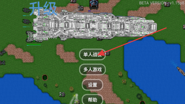 1、在游戲初始界面,有單人戰(zhàn)役、多人游戲、設(shè)置、幫助等選項(xiàng),點(diǎn)擊單人戰(zhàn)役按鈕,即可進(jìn)入單人游戲模式,開啟你的策略戰(zhàn)爭(zhēng)之旅。