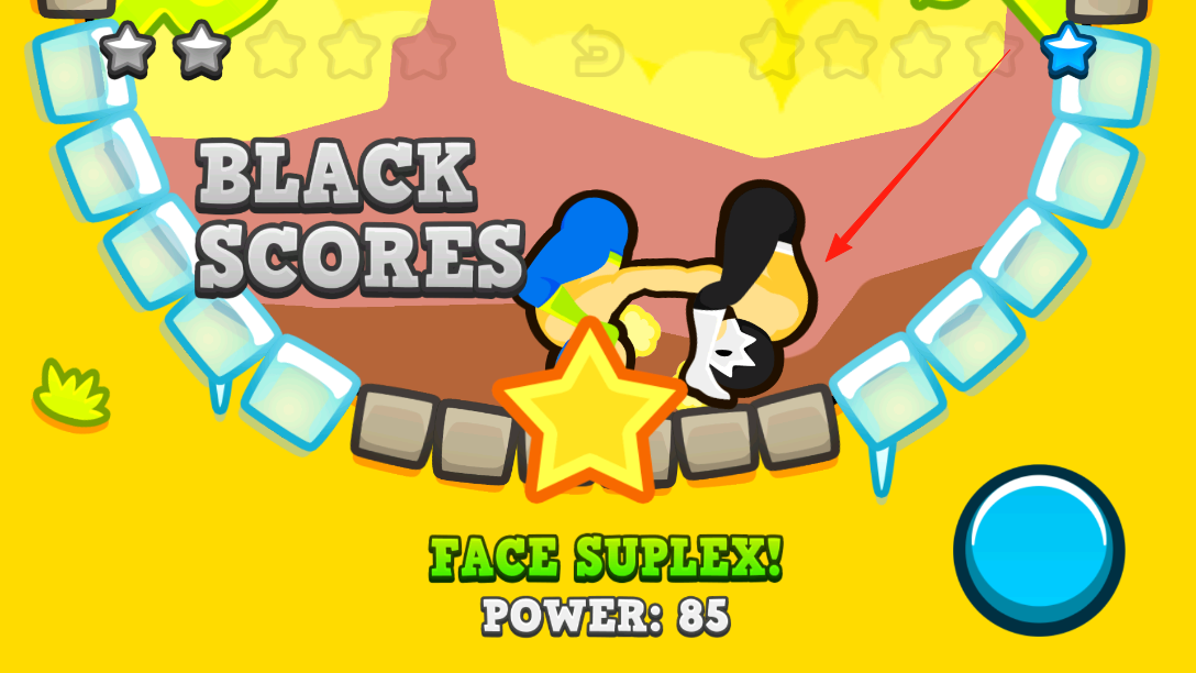 1、按下右側(cè)藍(lán)色按鈕,觸發(fā)角色跳躍,在對(duì)戰(zhàn)中借跳躍時(shí)機(jī)將對(duì)手頭部砸向地面,以此完成得分,開啟摔跤對(duì)決的核心循環(huán)。