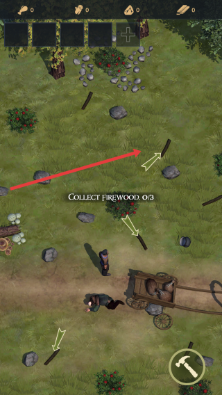 1、劇情演示跳過,先根據(jù)提示收集木材,移動角色至帶綠色箭頭的木材,自動采集,集齊3根。