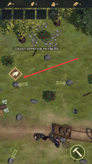2、收集完木材后繼續(xù)收集石頭,操控角色靠近箭頭指向的石頭采集3塊,完成前面提示里的任務(wù)。