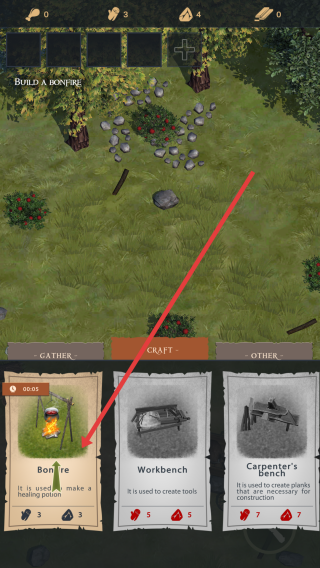 3、收集完所有相關(guān)的物資,進入CRAFT的界面,消耗3哥木材+3塊石頭制作,解鎖療傷等功能。