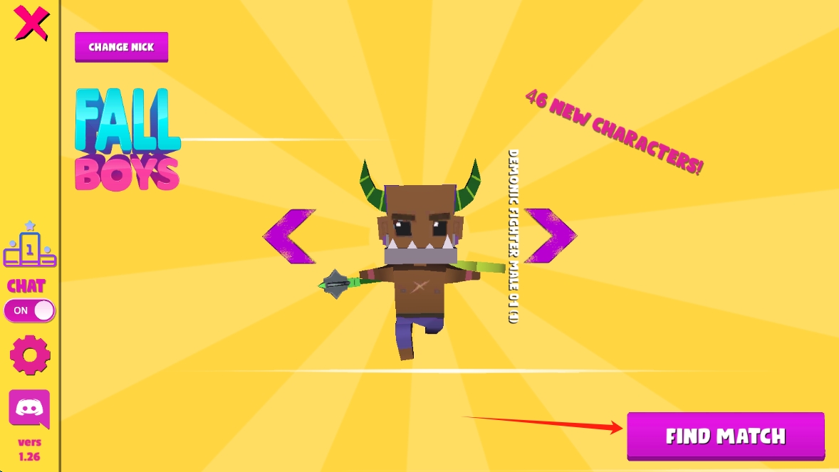 1、在Fall-Boys游戲匹配界面,挑選心儀角色如DEMONIC-FIGHTER-MALE-01,點擊FIND-MATCH,快速尋找游戲?qū)?,開啟歡樂競技。