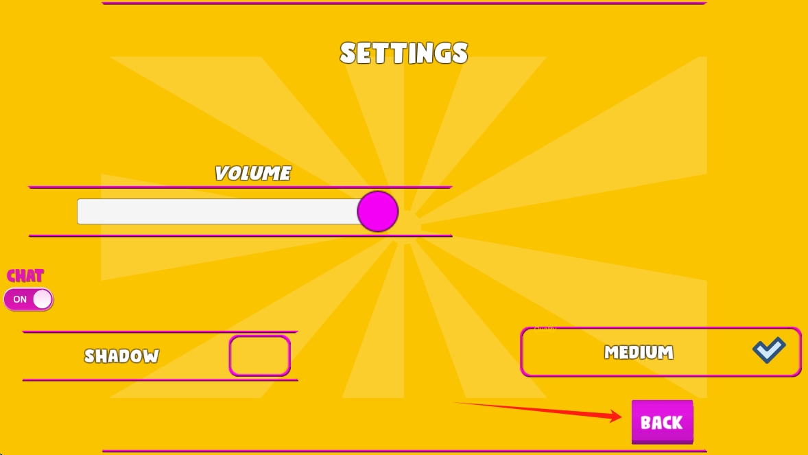 2、進入游戲設(shè)置界面,根據(jù)個人喜好,靈活調(diào)整音量VOLUME、陰影SHADOW等選項,打造舒適的游戲環(huán)境,設(shè)置完畢,點擊BACK返回主界面。