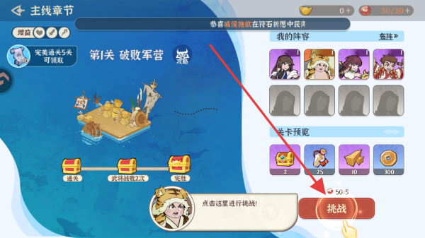 3、在主線章節(jié)界面,選擇合適的關卡,點擊挑戰(zhàn)按鈕,進入關卡戰(zhàn)斗,合理搭配陣容,運用策略擊敗敵人,獲取獎勵。