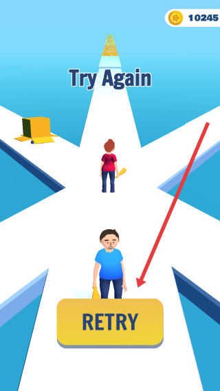 3、闖關(guān)失敗后,點(diǎn)擊下方黃色RETRY按鈕,可重置進(jìn)程,再次挑戰(zhàn)LEVEL-1,爭(zhēng)取順利通過(guò)旋轉(zhuǎn)障礙,繼續(xù)游戲征程。
